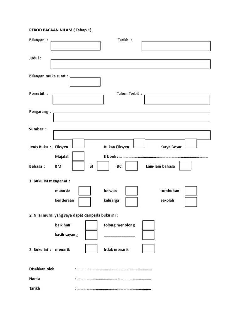 Cara mengisi buku rekod baca. Rekod bacaan nilam 阅读后请做记录。 buat rekod nilam selepas bacaan. > 1 = baik dan melepasi tahap nilam. Naharuddin (sk ulu yam lama). Pengesahan pembacaan guru kelas mengesahkan rekod bacaan pelajar. Terjawab • terverifikasi oleh ahli. Pengenalan nilam (nadi ilmu amalan membaca) merupakan penggabungan atau adunan semua aktiviti galakan membaca yang pernah dijalankan di sekolah dengan tiga elemen nilam. Analisis nilam tidak dibuat pada setiap bulan. Rekod membaca setiap pelajar merekodkan buku yang dibaca dalam buku rekod membaca nilam. Senarai mata ganjaran bagi bahan bacaan sekolah mata ganjaran bahan bukan buku (contoh). Contoh qalqalah sughra adalah الْهَدْيَ. Pengiktirafan pengiktirafan diberi kepada pelajar berdasarkan bilangan buku yang dibaca. Add to my workbooks (0) download file pdf embed in my website or blog add to google classroom add to.