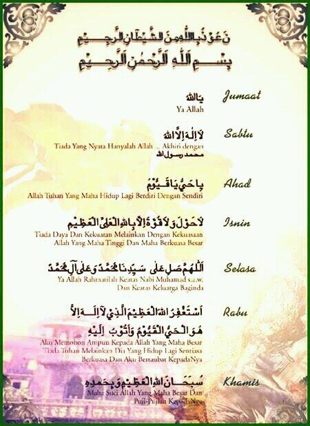 Kalau menampalkan pelekat ayat 1000 dinar ini di premis perniagaan, tapi solat tidak dikerjakan, amalan tidak jujur dalam perniagaan terus dibuat atau sebagainya, ini tidak bermakna kita mengamalkan ayat 1000 dinar. Masih ramai diantara umut islam di malaysia khusus. Juga dalam dzikir pagi kali ini, kami sertakan dengan faedah dari setiap dzikir berdasarkan hadits yang menyebutkan dzikir tersebut sehingga dengan itu bisa merenung maksud dzikir dan raih manfaatnya. A collection of dzikr and du'a to be recited daily after salah. # zikir harian # zikir harian rasulullah # zikir harian isnin hingga ahad # zikir harian dan maknanya # zikir harian selasa # zikir harian dalam bahasa rumi. Jika tiada urusan penting, luangkan sedikit. Sesiapa yang melazimkan dan tidak meninggalkan zikir ini insyallah zikrullah membentuk akhlak merubah e rumi 27022015 2. Barangsiapa yang mahukan ketenangan di dalam hatinya hendaklah perbanyakkan zikir. Ini adalah prinsip agama sekaligus dzikir yang paling agung yang dapat diucapkan dalam setiap waktu. Zikir asmaul husna lirik rumi dan bahasa arab. Zikir harian, amalan dan bacaan. Biar cuma 1 kali sehari tapi jika rutin itu lebih baik. Zikir/doa pelindung rasulullah dari segala kemudaratan, penyakit, kerugian, serangan musuh & sihir.